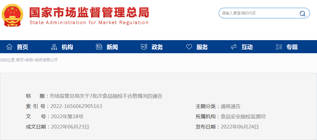 市场监管总局关于7批次食品抽检不合格情况的通告