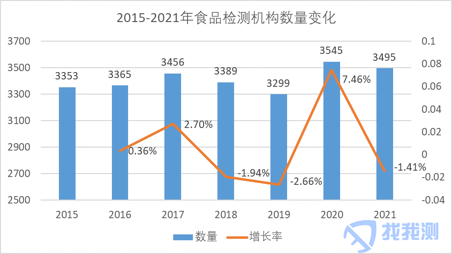 2015年至2021年,食品及食品接触材料检测机构营收从100.69亿元增长至186.29亿元,呈现逐年递增的趋势,但是增长的幅度呈现下降的趋势。