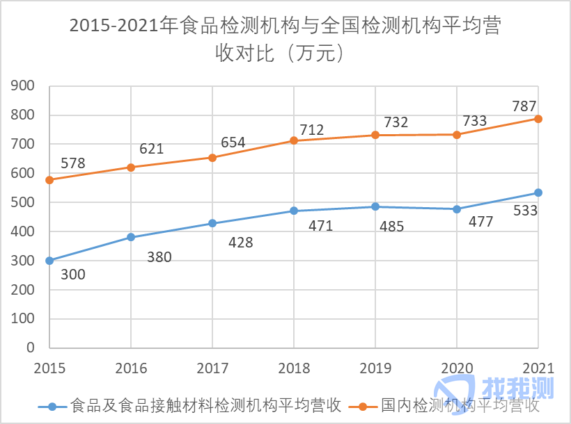 2015年-2021年,食品检测机构的平均营收呈现稳步增长的趋势,且增长趋势与全国检测机构的平均营收增长趋势一致,但值得一提的是,食品检测机构的平均营收2015年-2021年每年均大幅低于全国检测机构平均营收水平。例如,2021年,食品检测机构的平均营收仅为533万元,而全国检测机构平均营收水平为787万元,差距明显。此外,虽然食品检测机构2021年的营收相比2015年的300万元翻了将近一倍,但与全国检测机构的平均营收水平差距并未缩小。